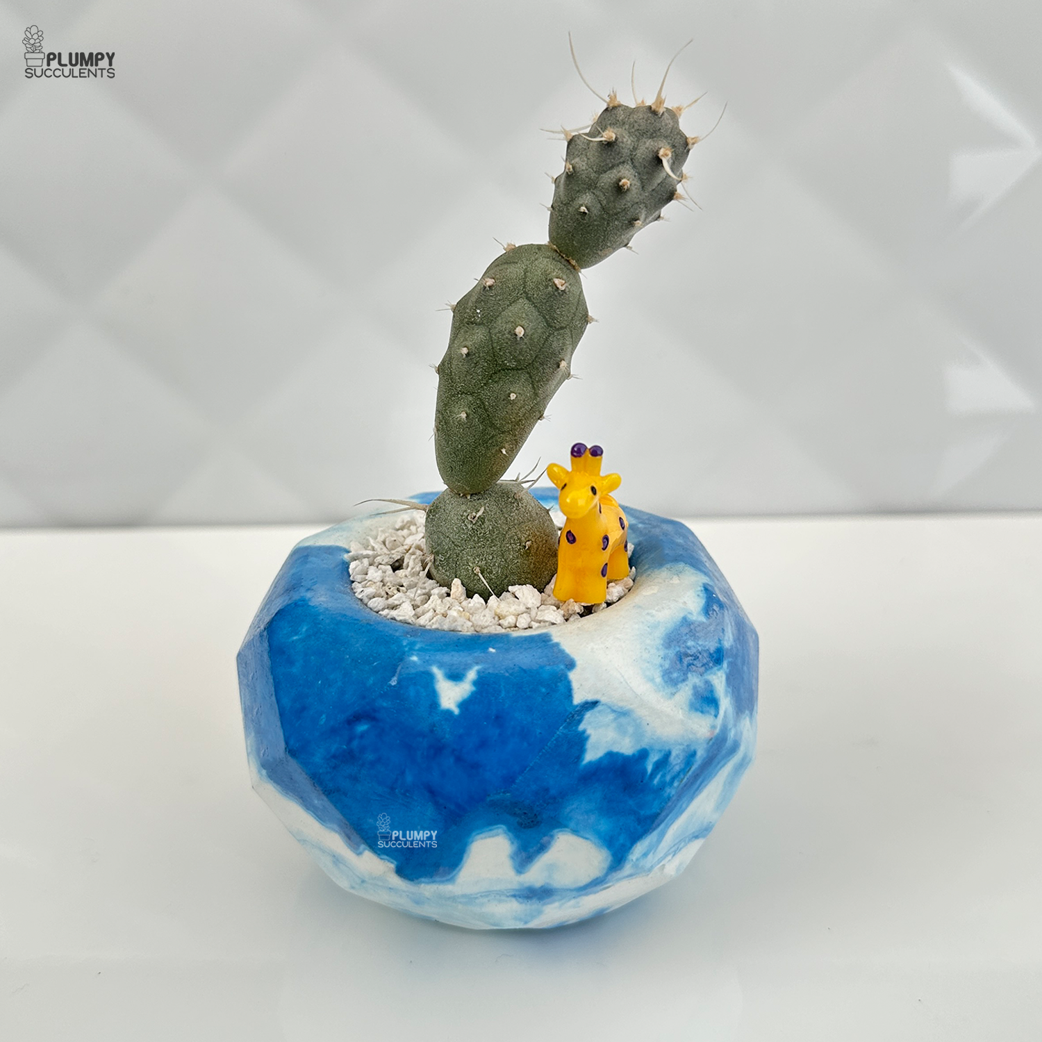 Tephrocactus Articulatus in Blue Marbly Geometric Round Planter