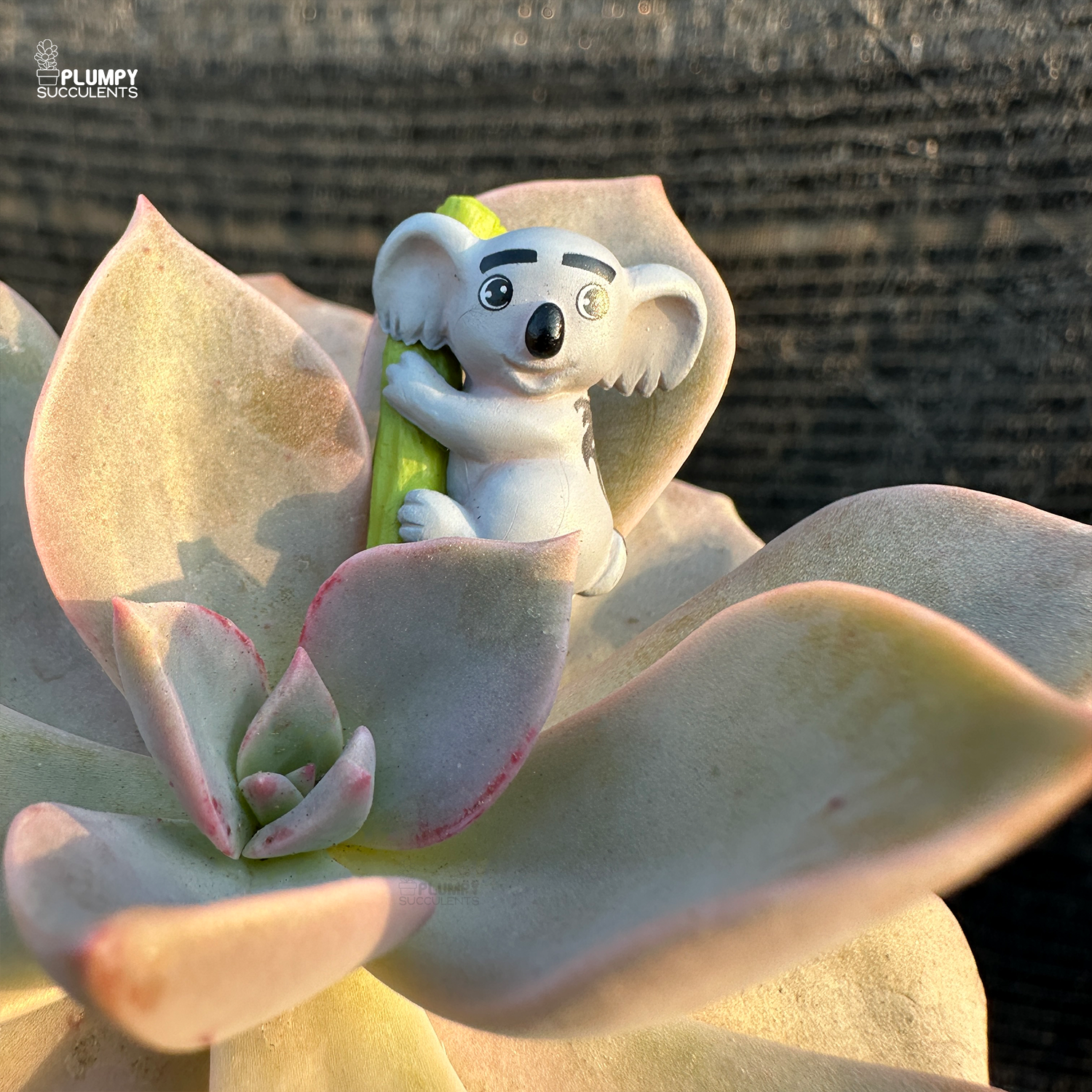Adorn your home with the captivating Echeveria Fred Ives, featuring mesmerizing purple tones. Planted in a 4-inch geometric yellow marbly planter, with a hugging koala figurine, this succulent arrangement exudes warmth and beauty.