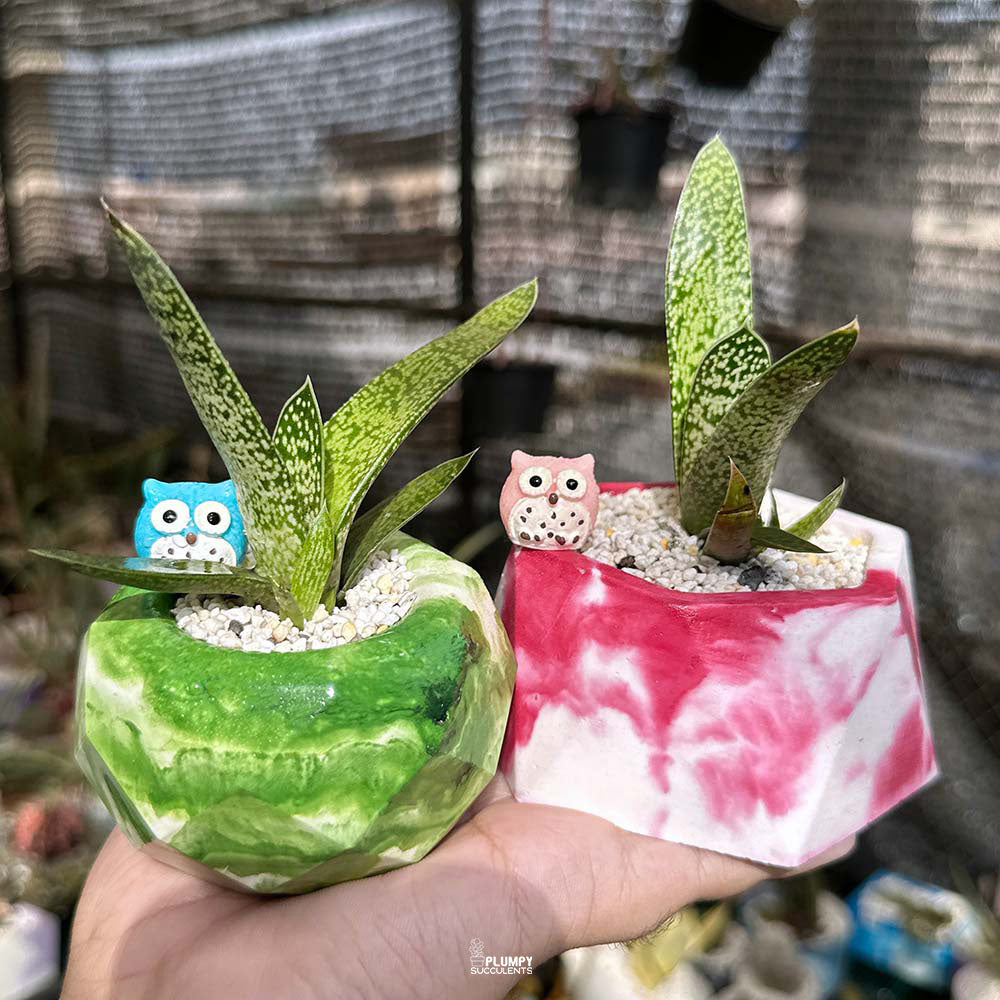 Twice the charm, twice the style! This duo features two stunning Gasteria Ox Tongue plants—one nestled in a bold red marbled geometric 4-inch planter, the other in a sleek 3-inch round green marbled geometric pot with a playful blue owl figurine. Perfect for bright indoor corners, desks, or gifting, this set brings texture, color, and a touch of whimsy to your space.
