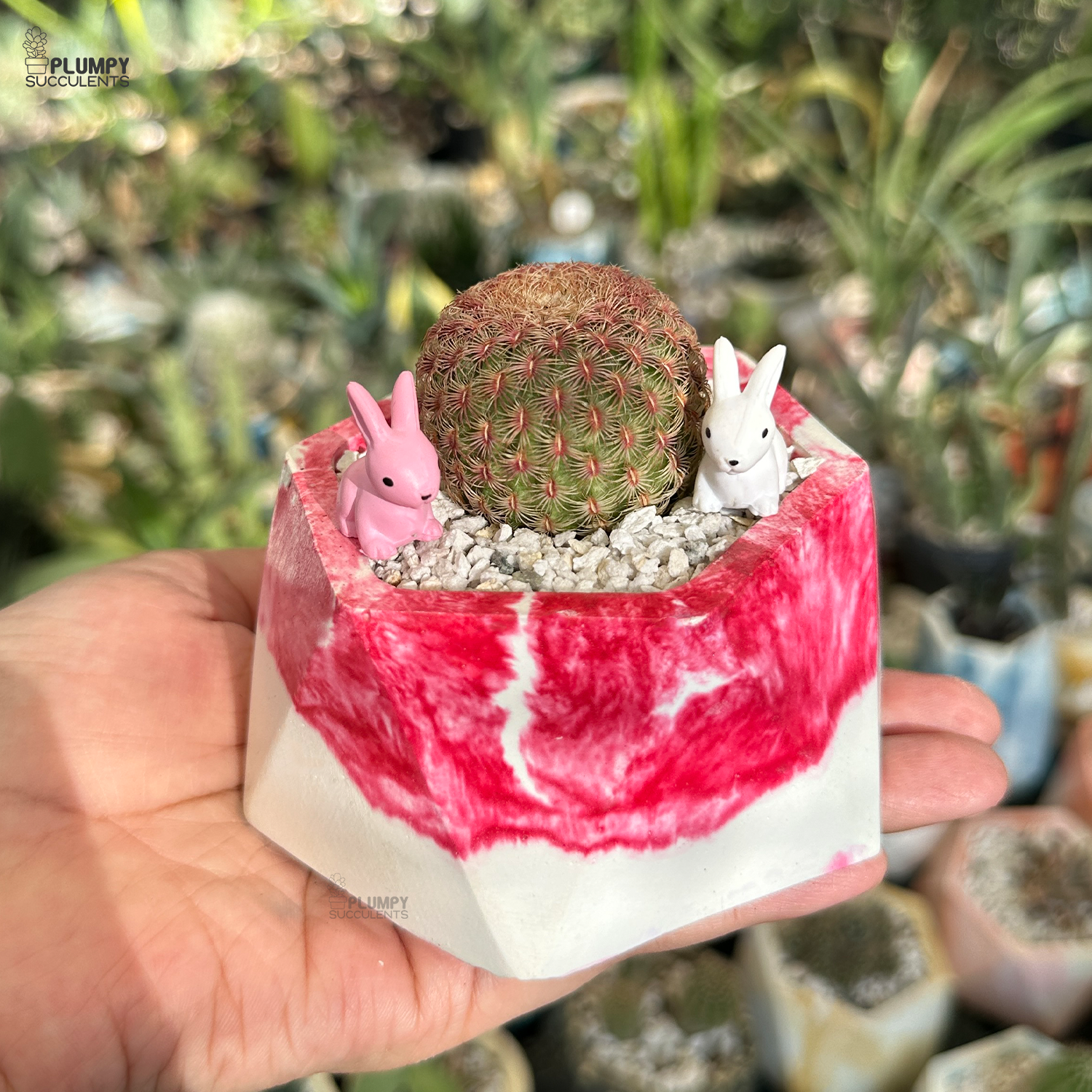 The Rainbow cactus features vibrant pink thorns and is set in a stylish red marbly geometric planter. With two adorable rabbit figurines sitting beside it, this plant adds a lively touch to any room.