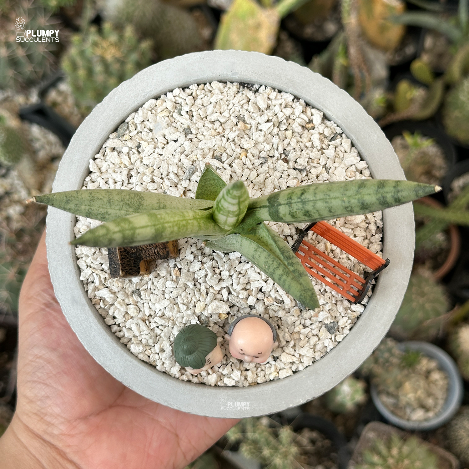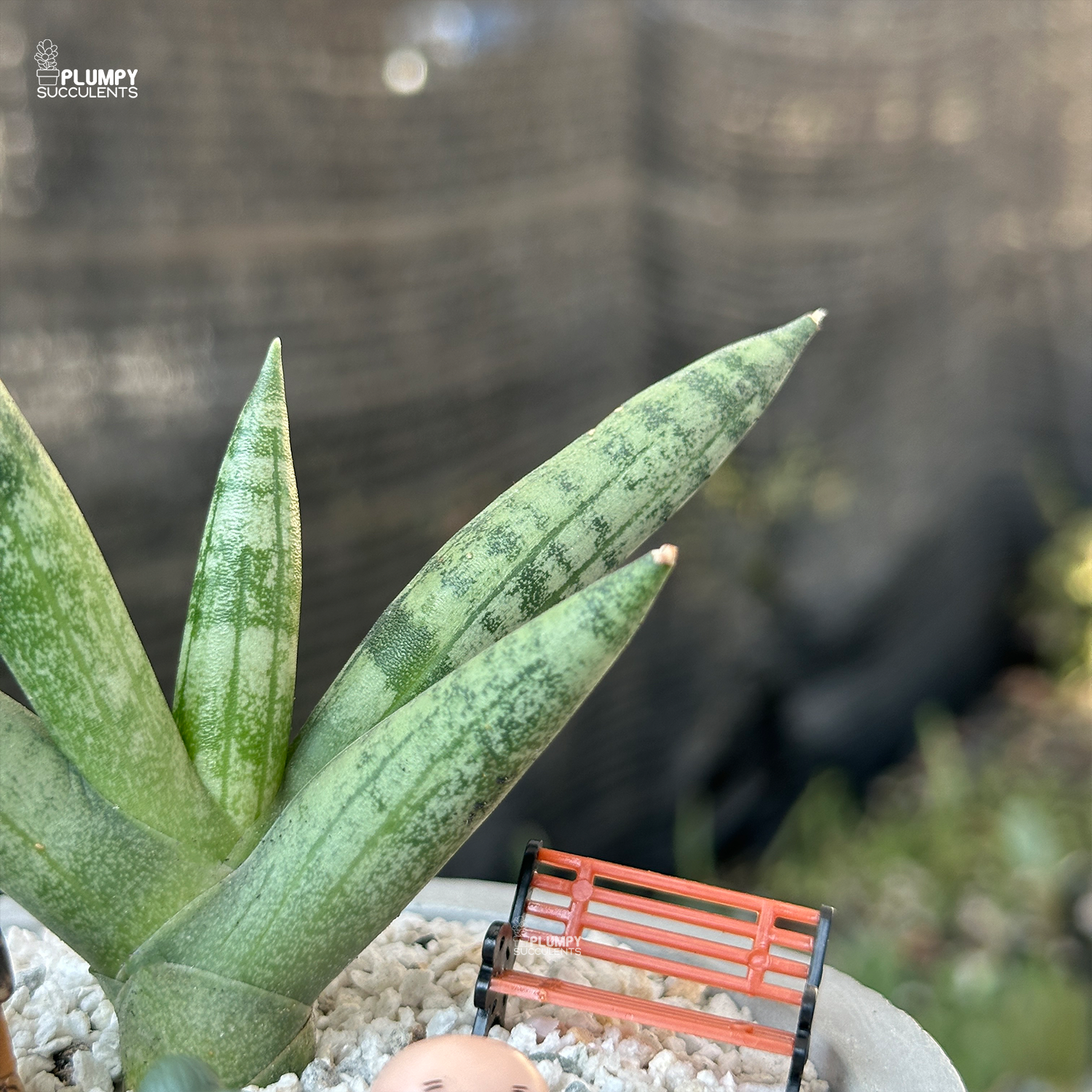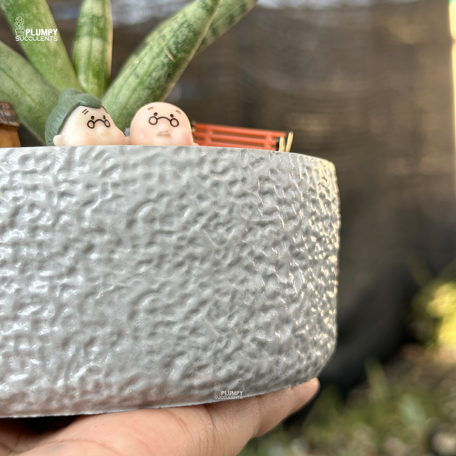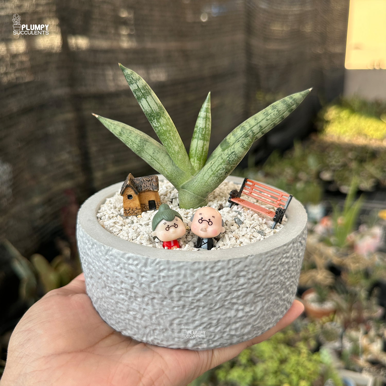 This charming mini garden features a Sansveria Cylindrica, one of NASA's top 10 air-purifying plants, perfect for refreshing your indoor air naturally. Nestled among the greenery, you'll find a rustic miniature house, a park bench, and a heartwarming duo of an old couple figurine—a tribute to growing old together with love and care.