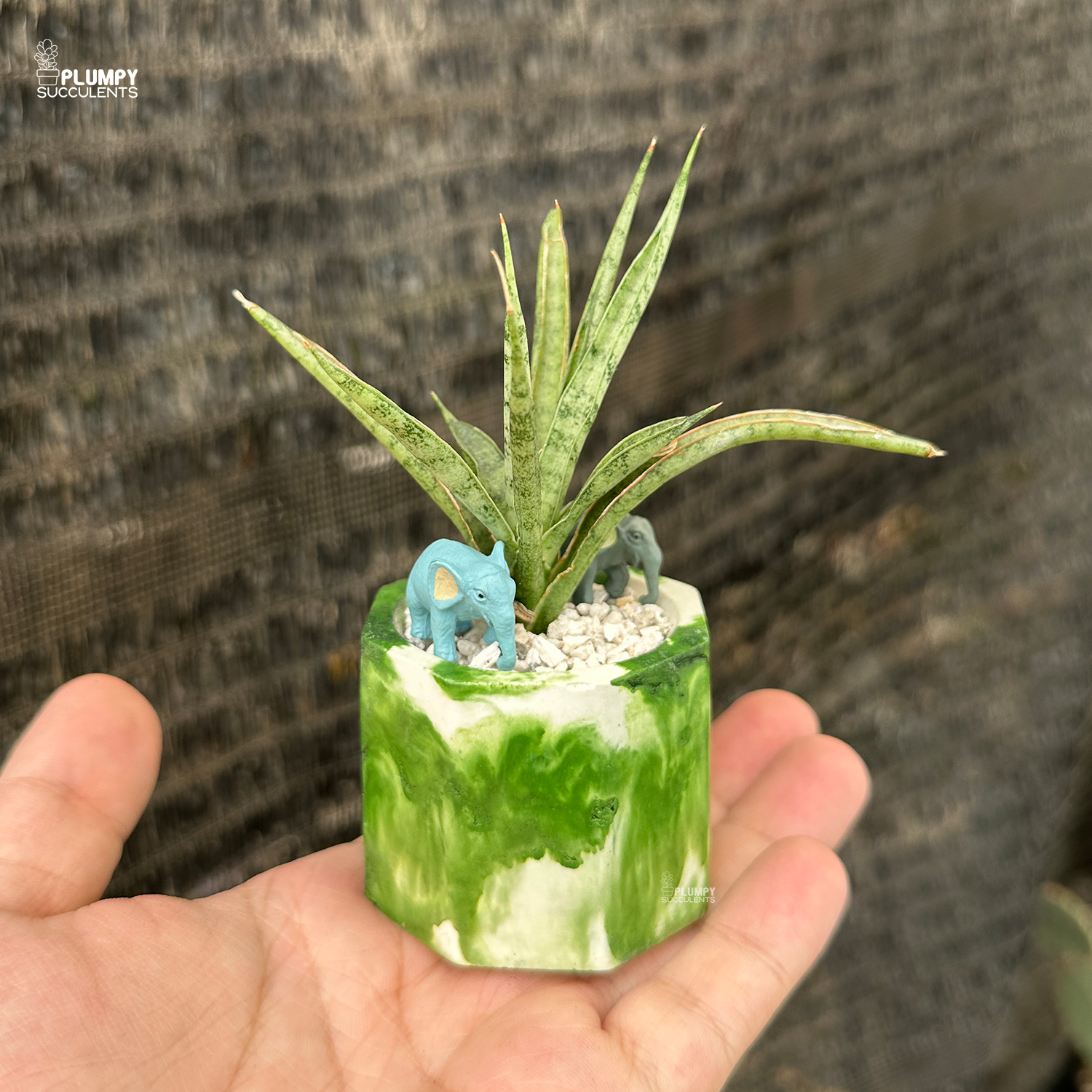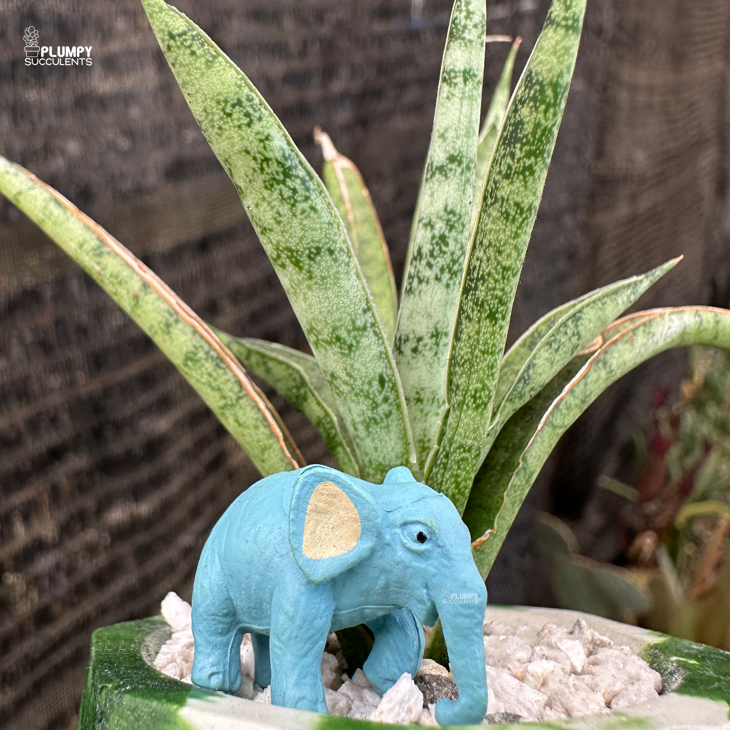 Transform your space with the Sansevieria (Snake Plant), a top 10 air-purifying plant on NASA's list. Planted in a 2-inch green marbly octagonal planter, this low-maintenance indoor plant is perfect for improving air quality. Featuring a cute blue elephant figurine standing beneath, this mini garden adds charm and personality to any room.