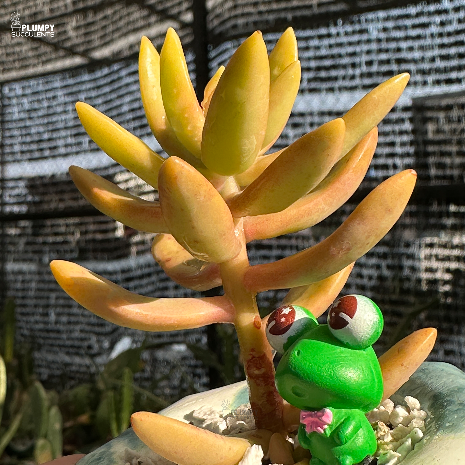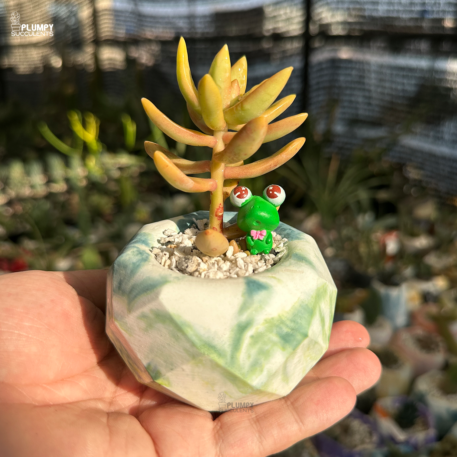 The vibrant Sedum Adolphi "Golden Sedum" displays its signature golden-yellow hues. Set in a 3-inch geometric round green marbly planter, with a frog figurine looking upward, this succulent setup is nothing short of magical.